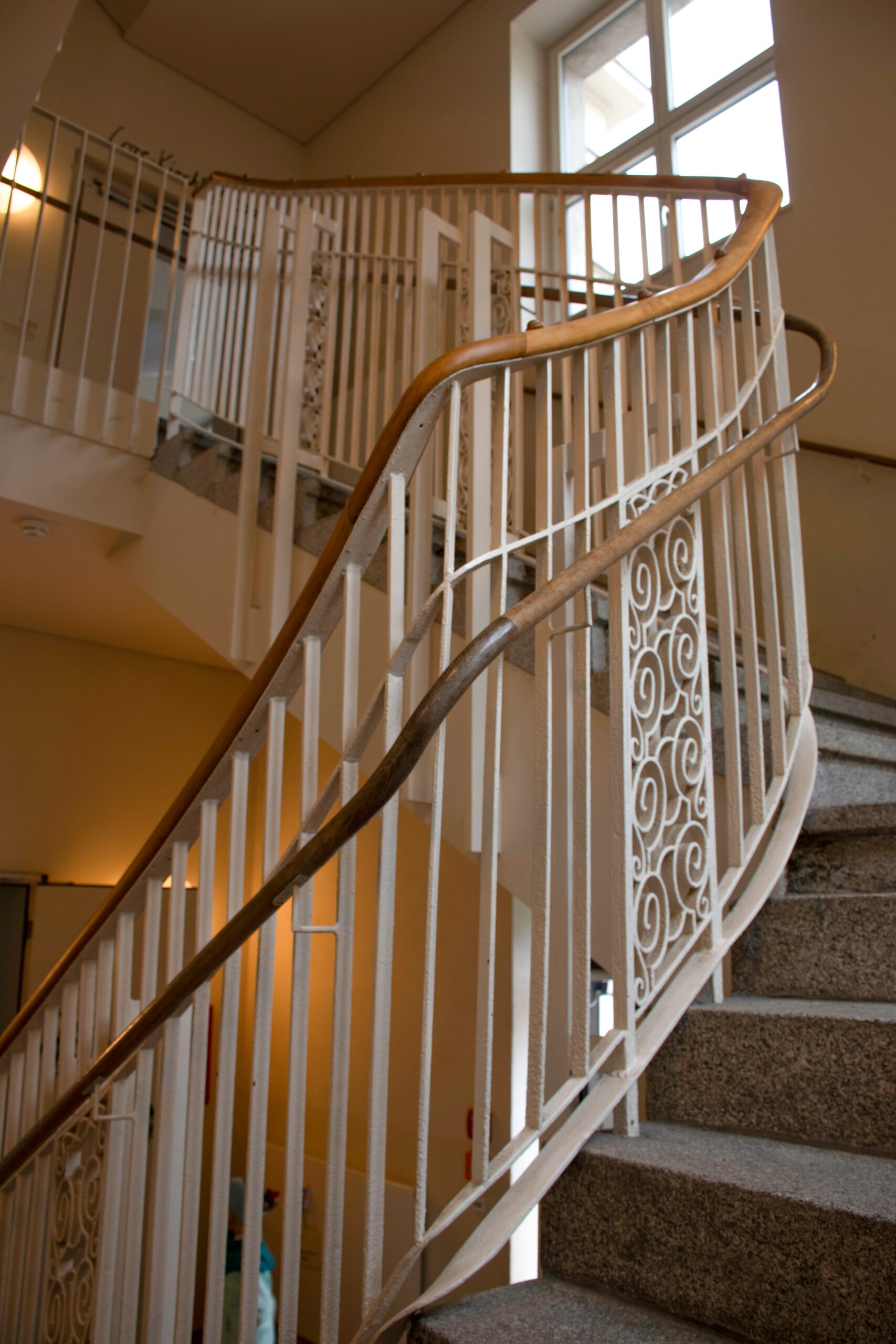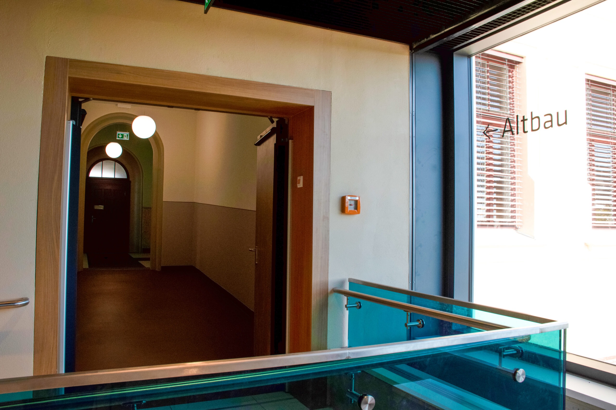Historische Gebäude kindgerecht — Das forum thomanum liegt auf dem Gelände der ehemaligen Lutherkirchgemeinde. Der Neubau bietet helle Klassen, Fachräume für Musik, Medien und Handwerk. Der sanierte Altbau dient als Hort mit Bühne und Kreativräumen. Er wurde an die Bedürfnisse der Schülerinnen und Schüler angepasst, wie der Handlauf verdeutlicht.