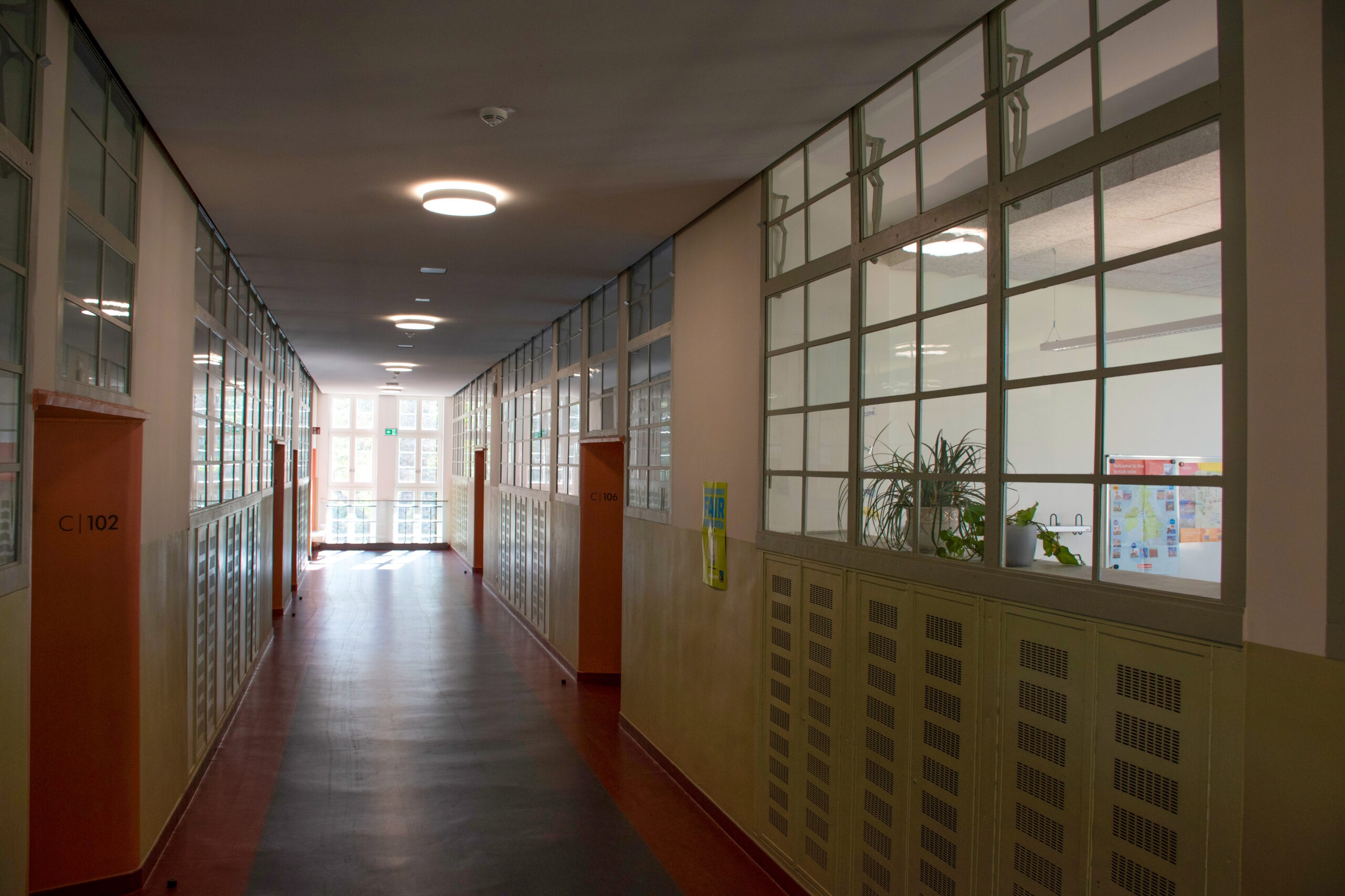 Hauptsache hell und luftig — Am Ende des Flures öffnet sich ein heller Freilernbereich. Großzügige Glasfronten zwischen Klassenräumen und Fluren leiten das einfallende Tageslicht weiter – bis in die gegenüberliegenden Räume. Obergadenfenster lassen sich öffnen und sorgen so auch im Flur für frische Luft.