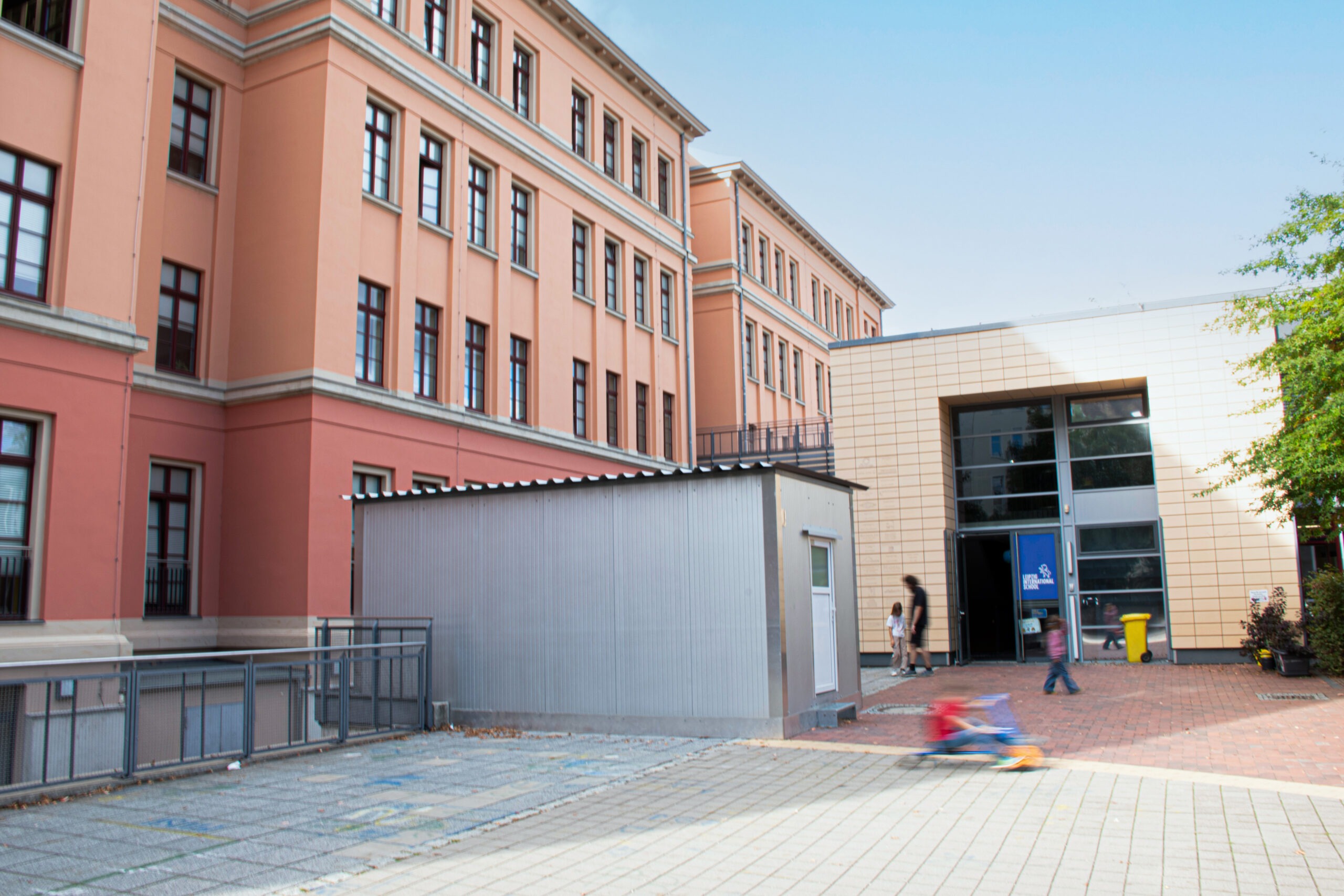 Ein Lerncampus mit Geschichte — Die Leipzig International School zog 2001 in das erste, 1891 eröffnete Gymnasium in Schleußig ein. Anstelle der alten Turnhalle entstand 2006/07 ein tieferliegender Neubau mit Sport-, Veranstaltungs- und Unterrichtsräumen sowie einer Dachterrasse. Die Brücke dazwischen führt auf das Dach des Neubaus, das den Campus geschickt erweitert.