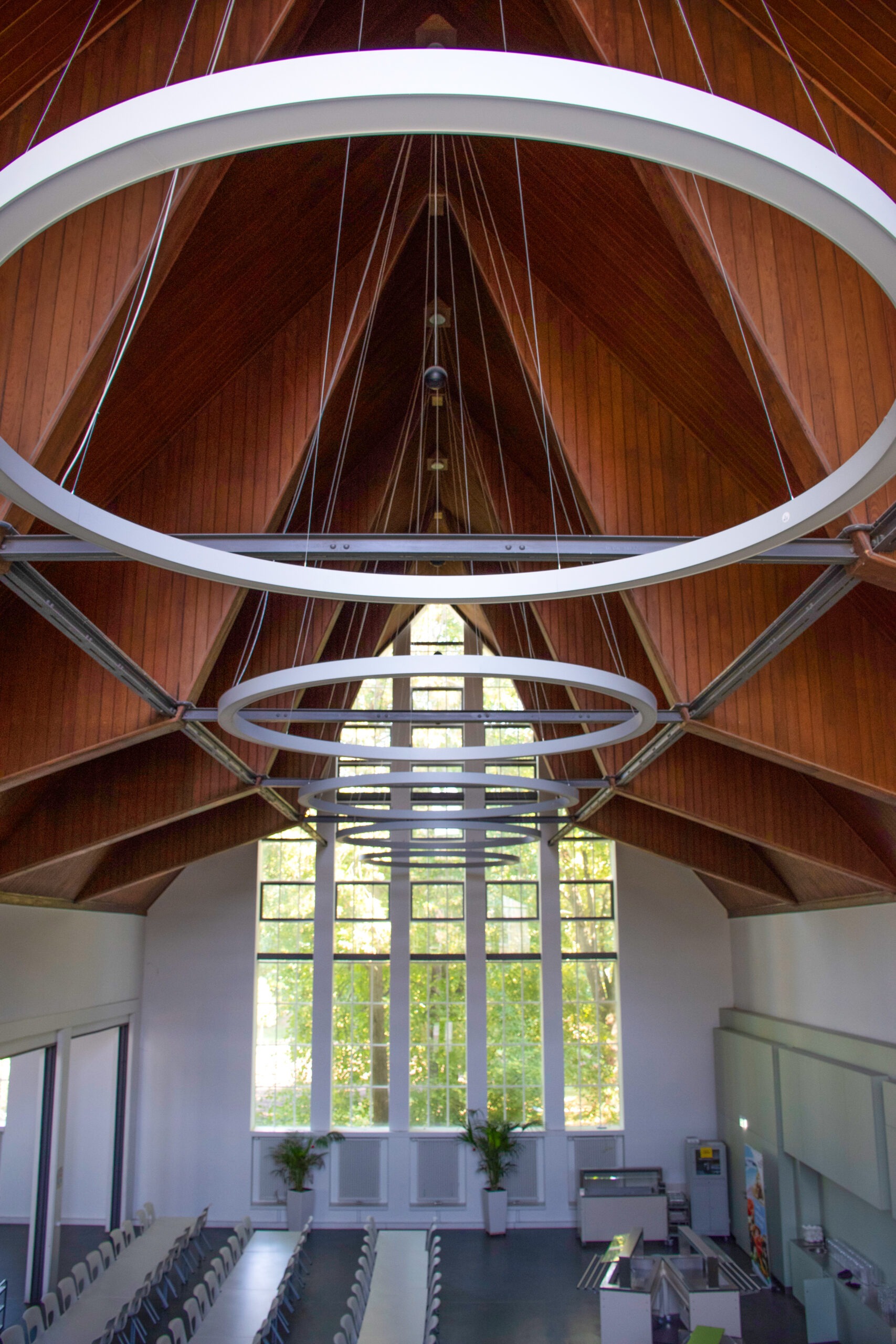 Raum für viele Anlässe — Der Mehrzweckbau der Schule am Palmengarten wurde als Aula, Speisesaal und auch als Turnhalle genutzt. Bewegliche Wände erlauben noch heute flexible Raumnutzungen. Die hölzerne Deckenkonstruktion in Form eines umgedrehten Schiffsrumpfs ist typisch für die 1920er Jahre.