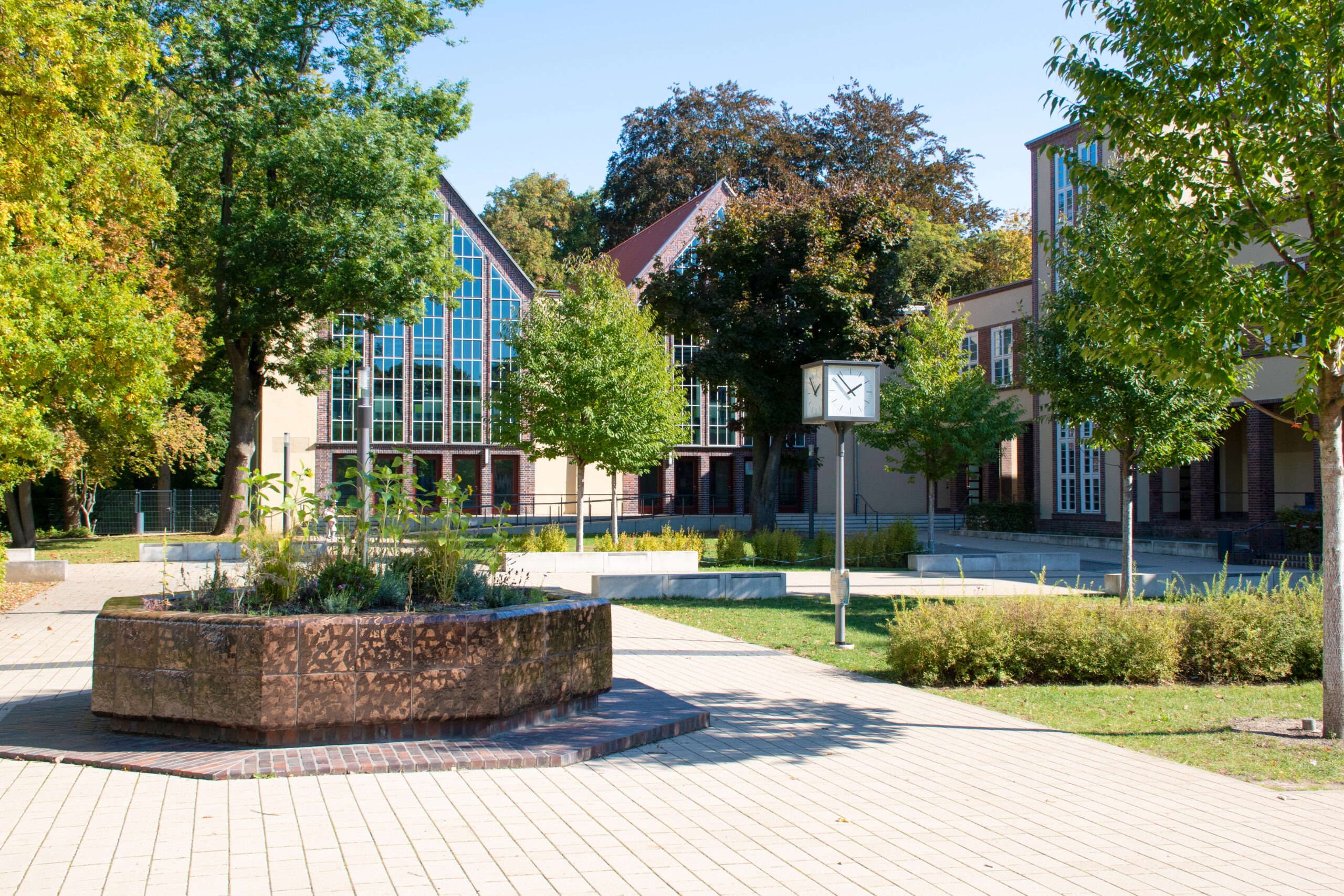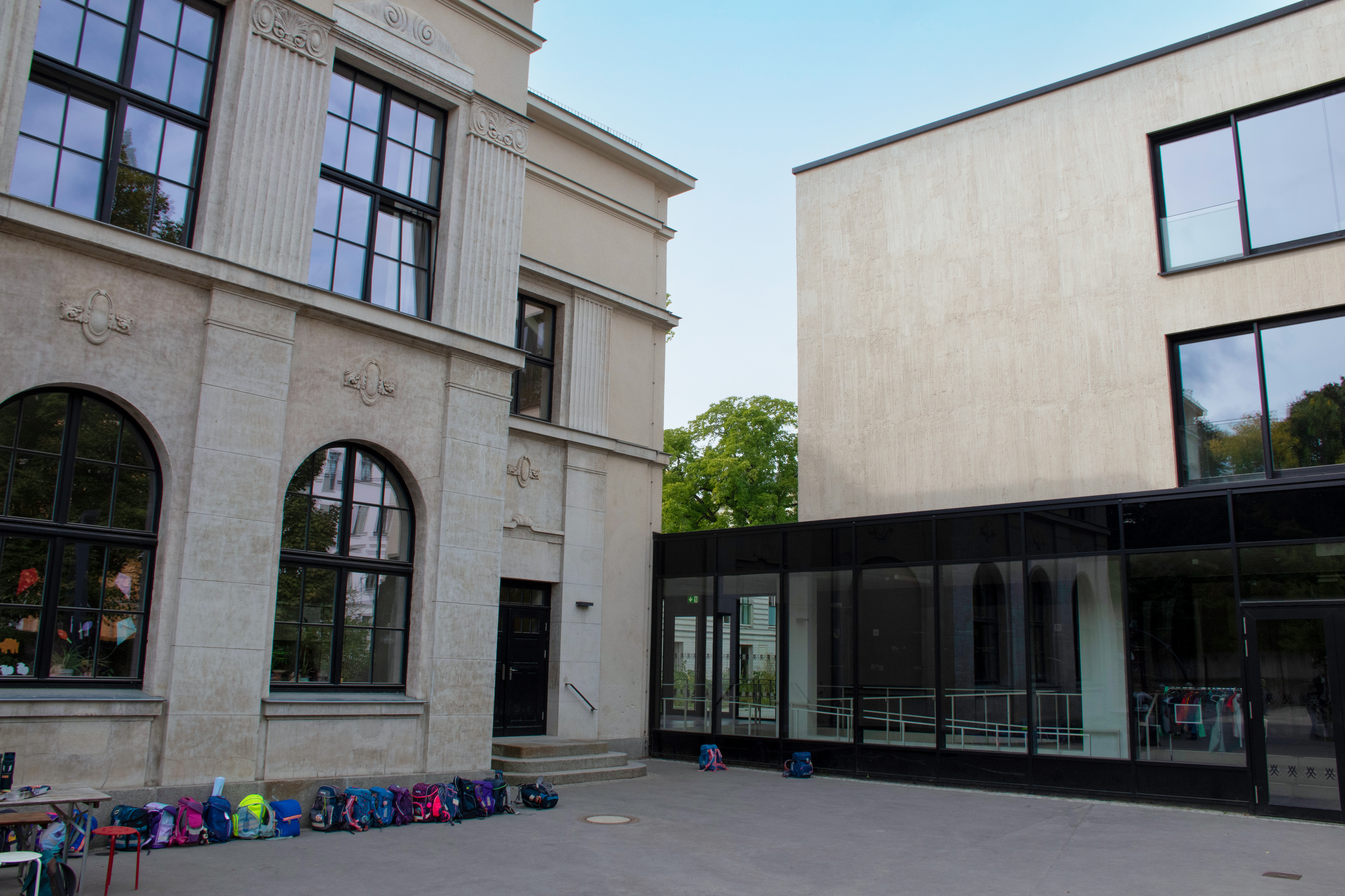 Sachlich und transparent — Durchgängige Glasfassaden der heutigen Schule am Palmengarten lassen viel Licht in Klassenräume und Flure und schaffen Transparenz. Klare, funktionale Bauformen prägen das Erscheinungsbild des Gebäudes. So ist noch heute die architektonische Idee des Funktionalismus und der Sachlichkeit der 1920er Jahre erkennbar.