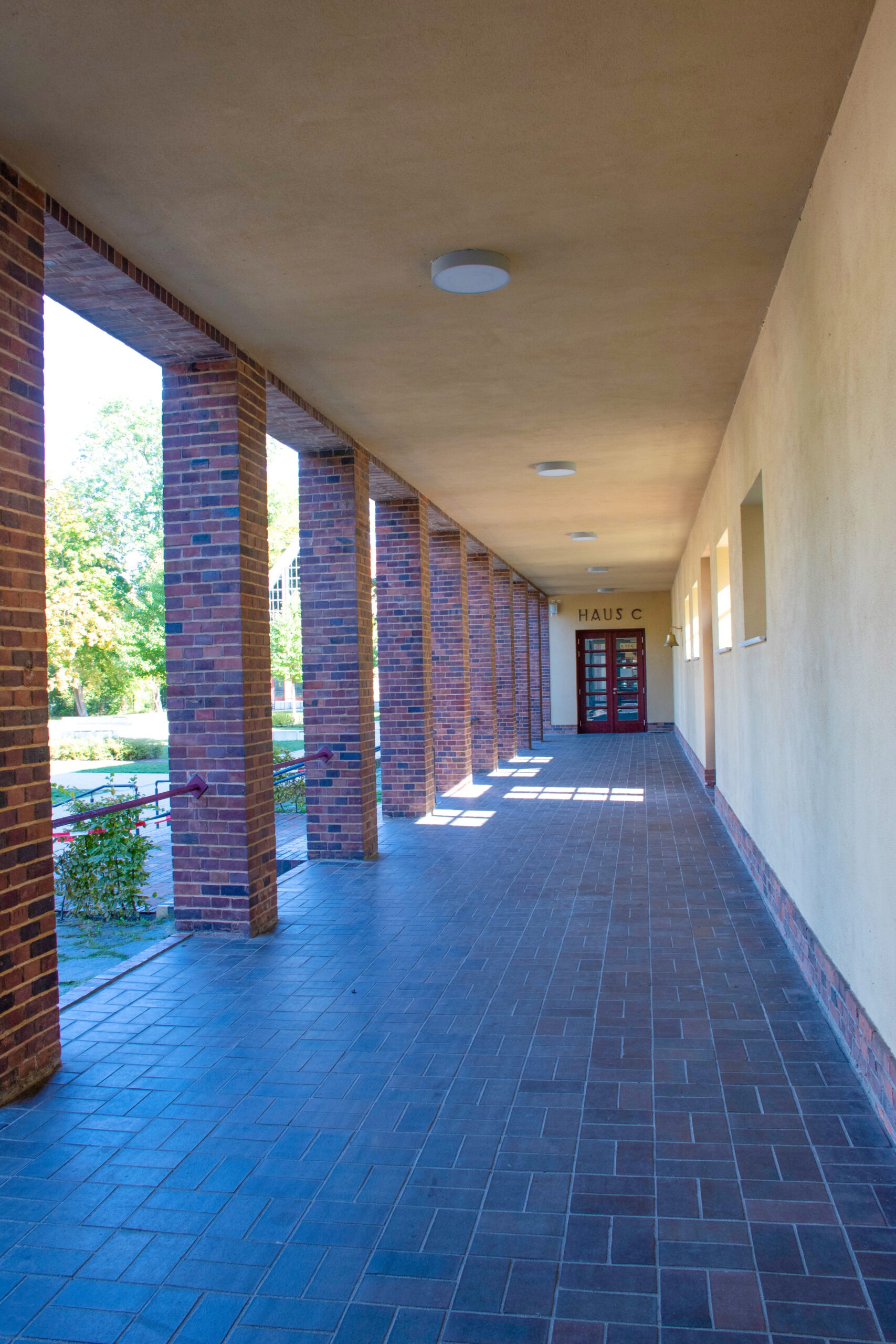 Architektur für Bewegung — Die Laubengänge der Schule am Palmengarten verbinden die Unterrichtsgebäude. Der Wandelgang im Stil eines antiken Portikus bietet bis heute die Möglichkeit zu rhetorischen Übungen: Gedichte können am besten im Gehen gelernt, Dialoge rhythmisiert werden.