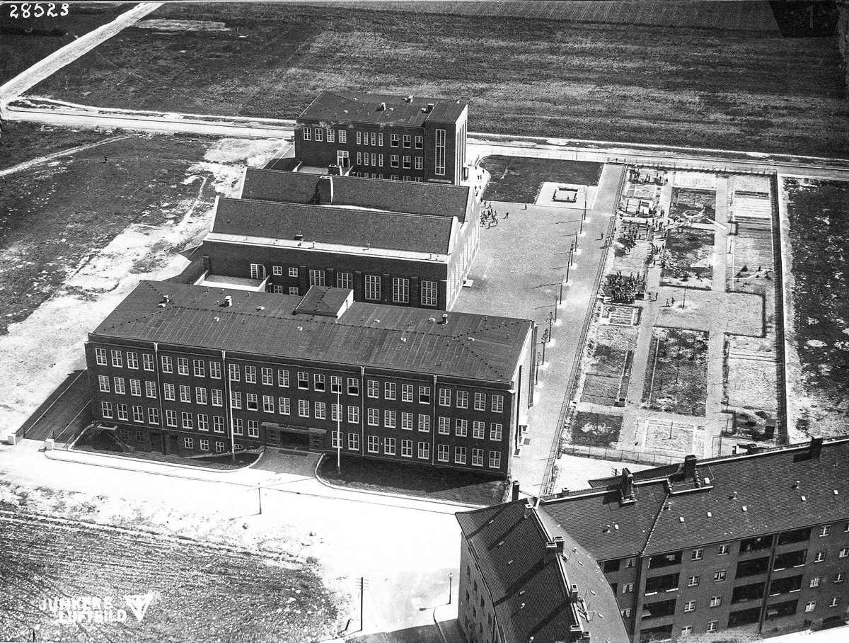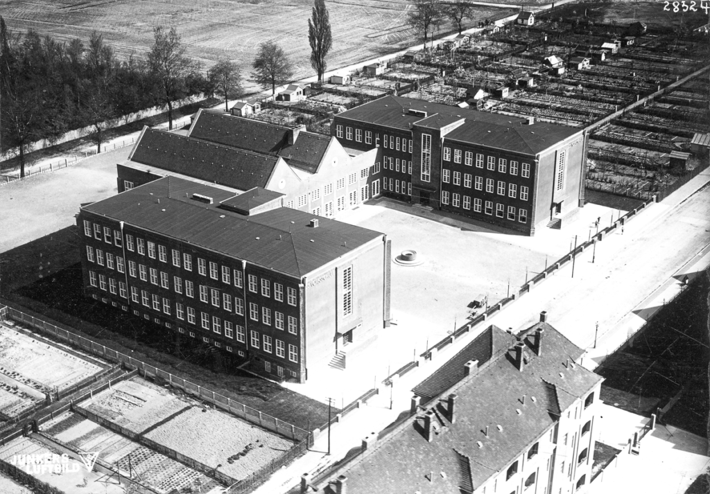 Der Leipziger Schultyp — Die heutige Schule Ratzelstraße, das Berufliche Schulzentrum (oben) und die Schule am Palmengarten (unten) sind prägende Beispiele dieses Schultyps. In grüner Umgebung errichtet, zeigen sie mit direkten Zugängen ins Freie das damalige Ideal offener Lernarchitektur. Eine zentrale Doppelturnhalle, erkennbar an den markanten Spitzdächern, diente auch als Speisesaal, Aula und Versammlungsraum.