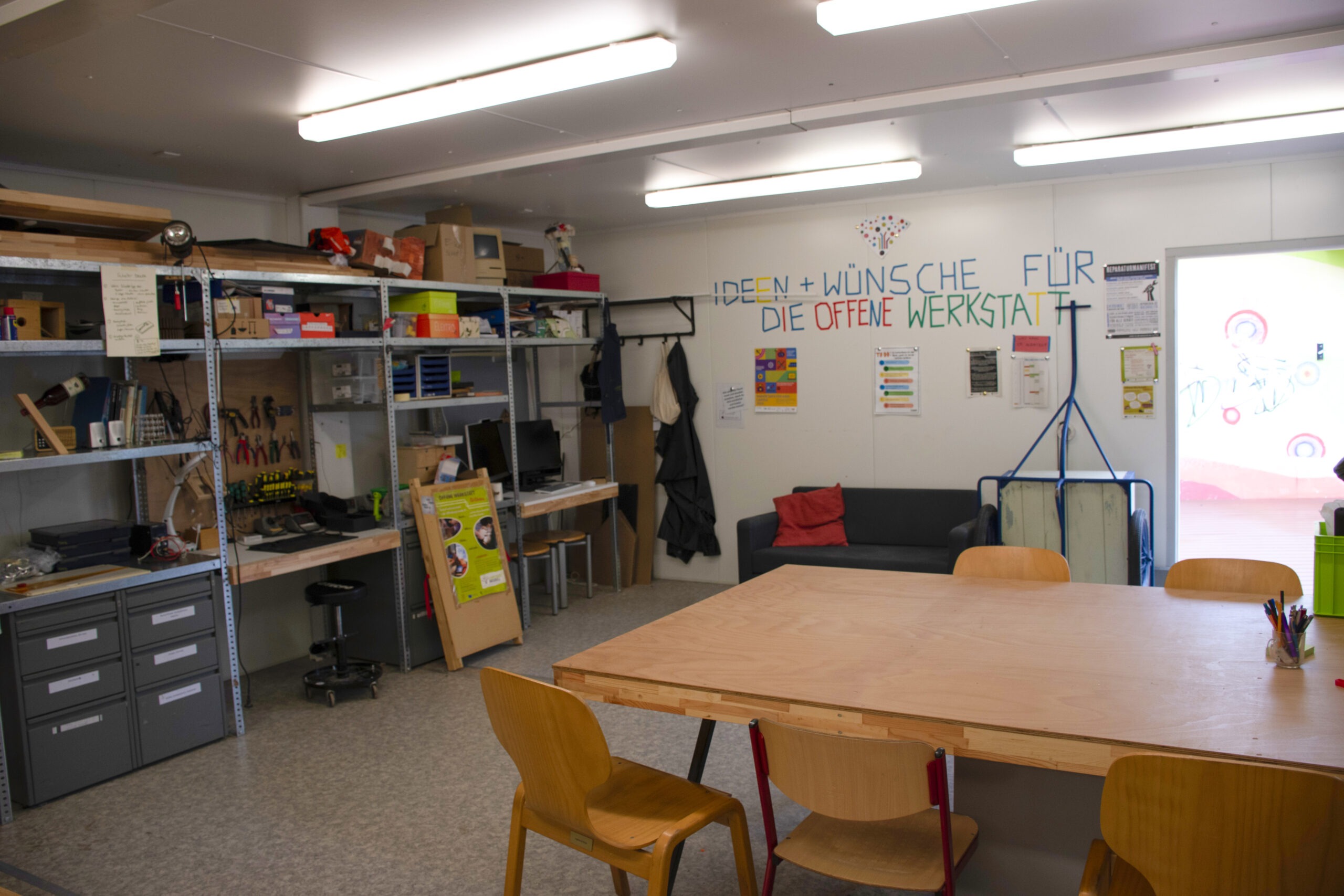 Offenes Werkeln — Die Werkstatt Grünau als Teil der Leipziger Modellschule ist ein kreativer Treffpunkt, der offen für alle ist. Die Container bieten Räume für Jung und Alt. Mit Maschinen und Werkzeugen entstehen Do-It- Yourself-Projekte.