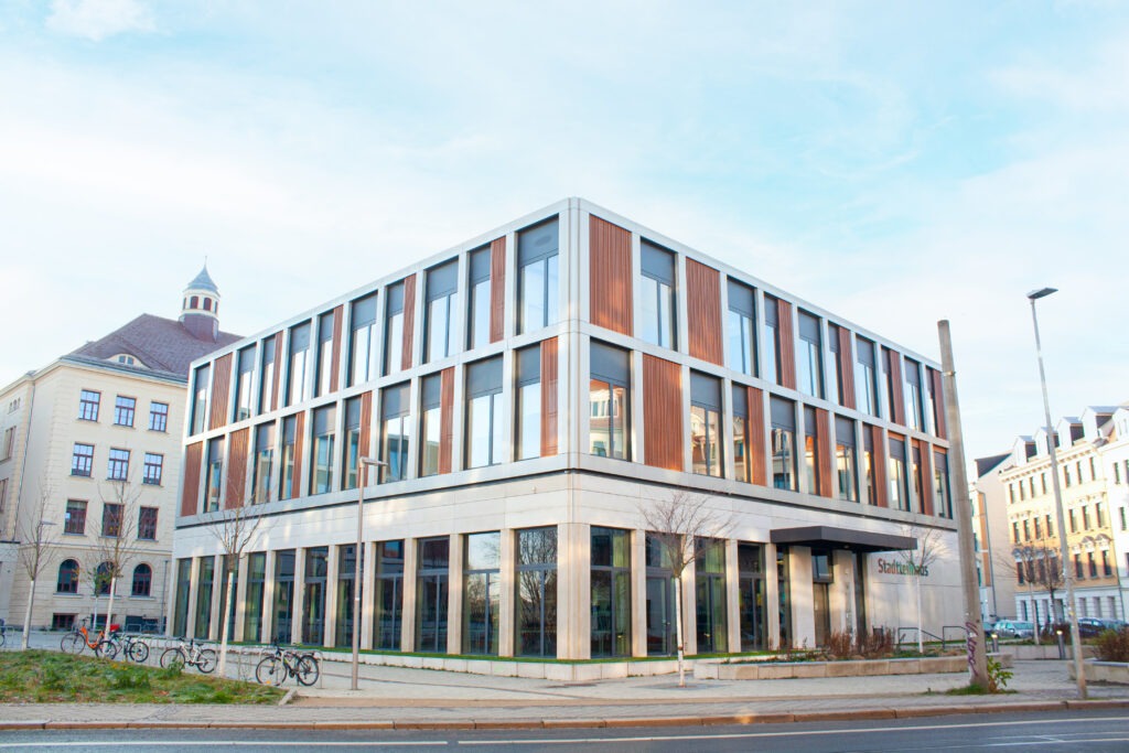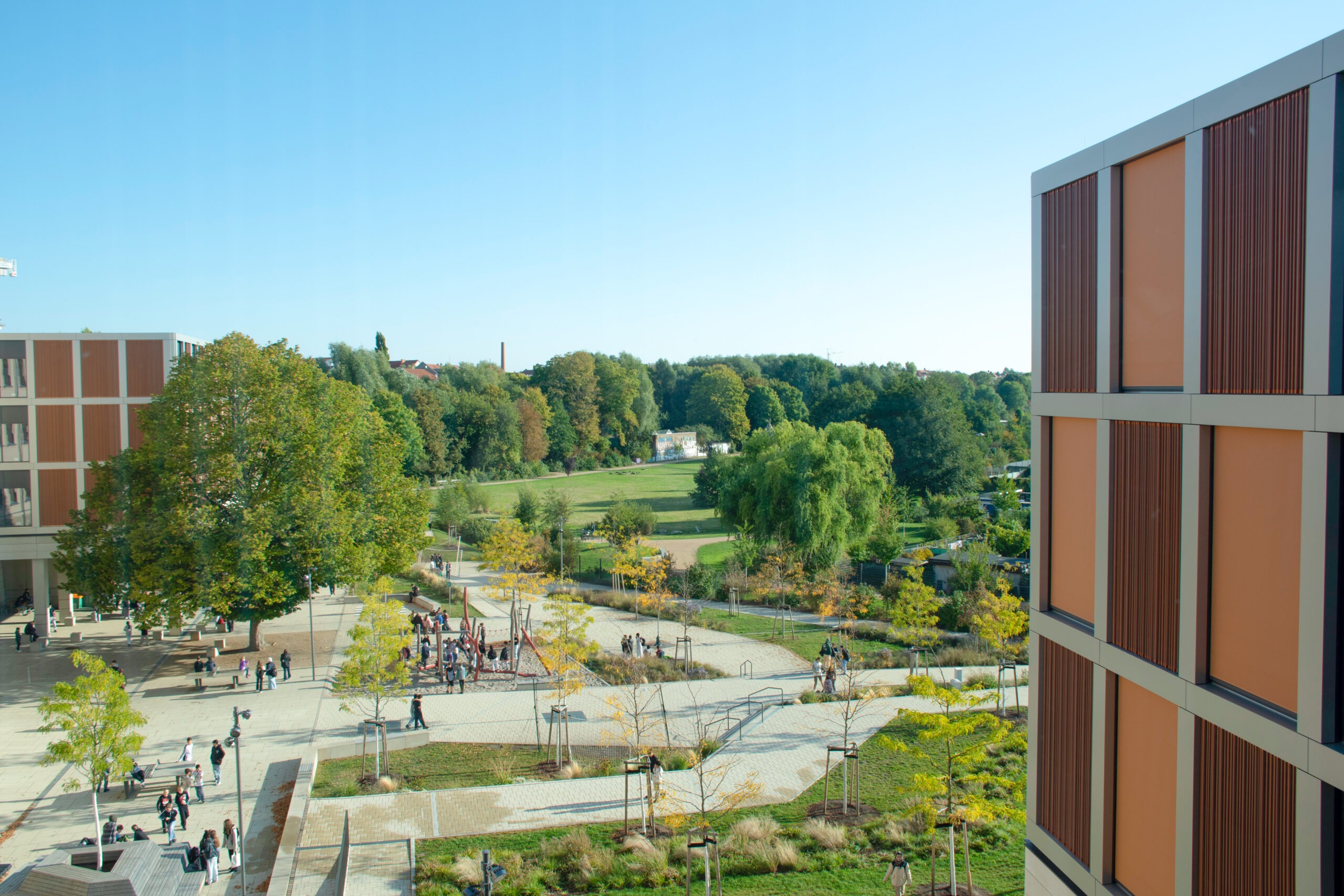 Offen in alle Richtungen — Der Blick schweift über den Schulhof bis zur Rietzschke-Aue hinter der Quartiersschule Ihmelsstraße. Durch die Nähe zum Park bieten sich gemeinsame Aktivitäten von Schule und Stadtteil an. Im Stadtteilhaus auf dem Vorplatz – zugleich Aula und Mensa der Schule – gibt es Angebote der Familienberatung, des Quartiersmanagements sowie der Musik- und Volkshochschule.