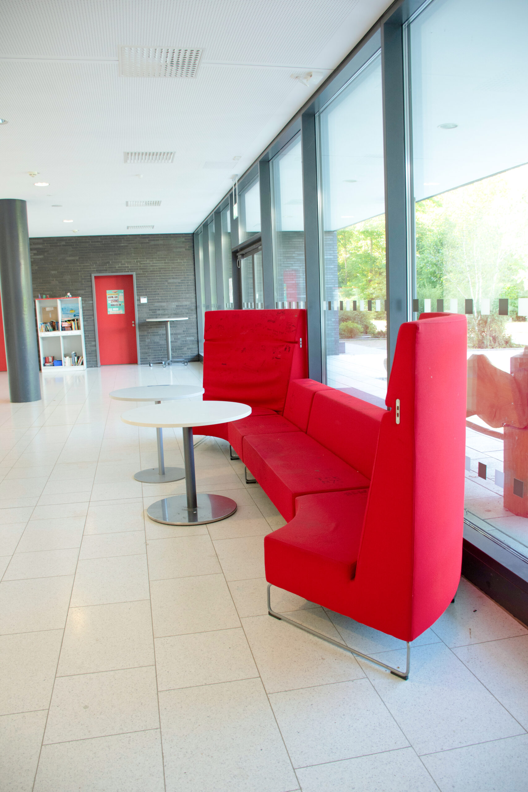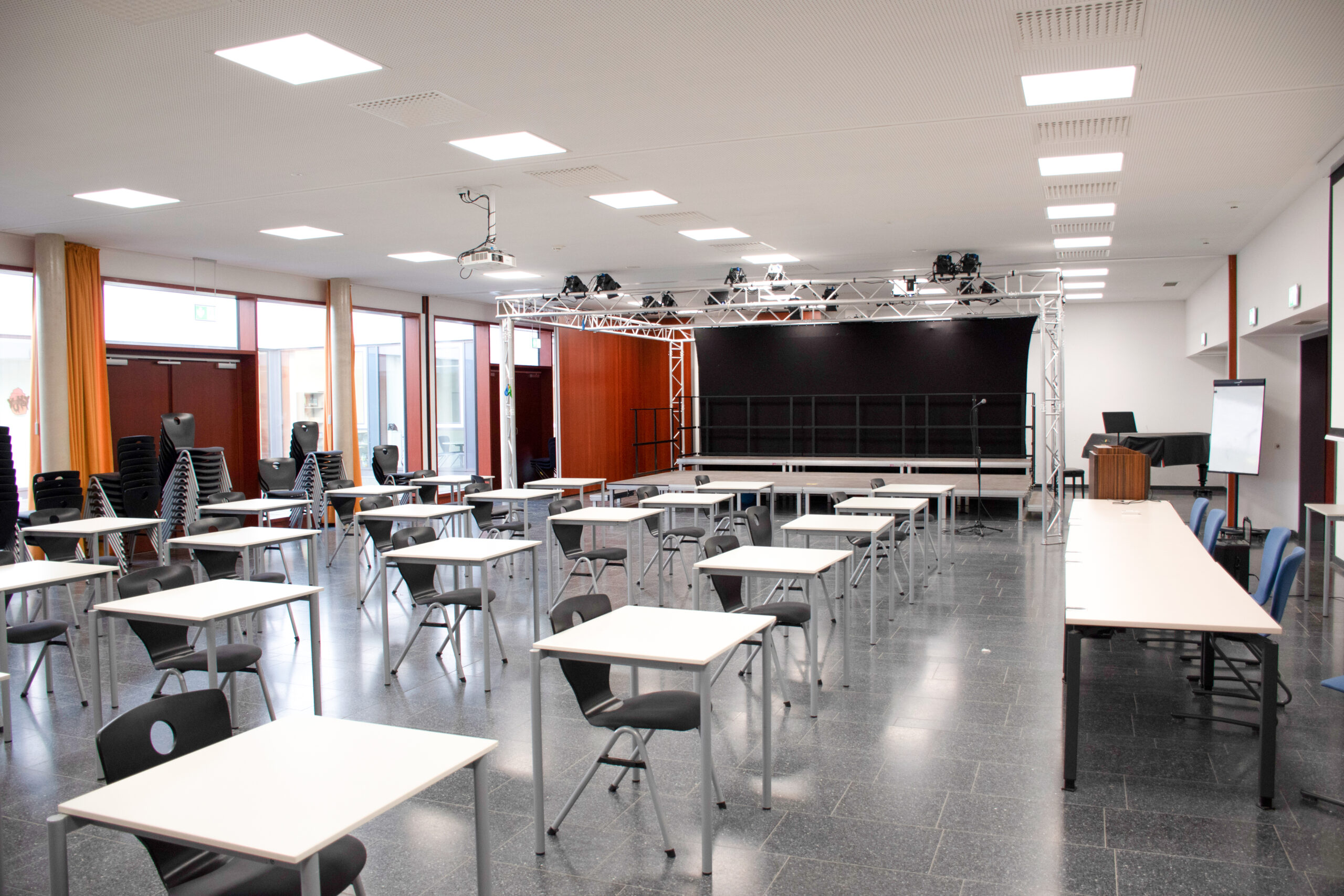 Fließender Übergang — Aula, Foyer und Schulhof mit einer kleinen Bühne verbinden sich in der Gerda-Taro-Schule zu einem zusammenhängenden Bereich. Er bereichert das Schulleben und kann Raum für Präsentationen und kulturelle Veranstaltungen im Stadtteil bieten.