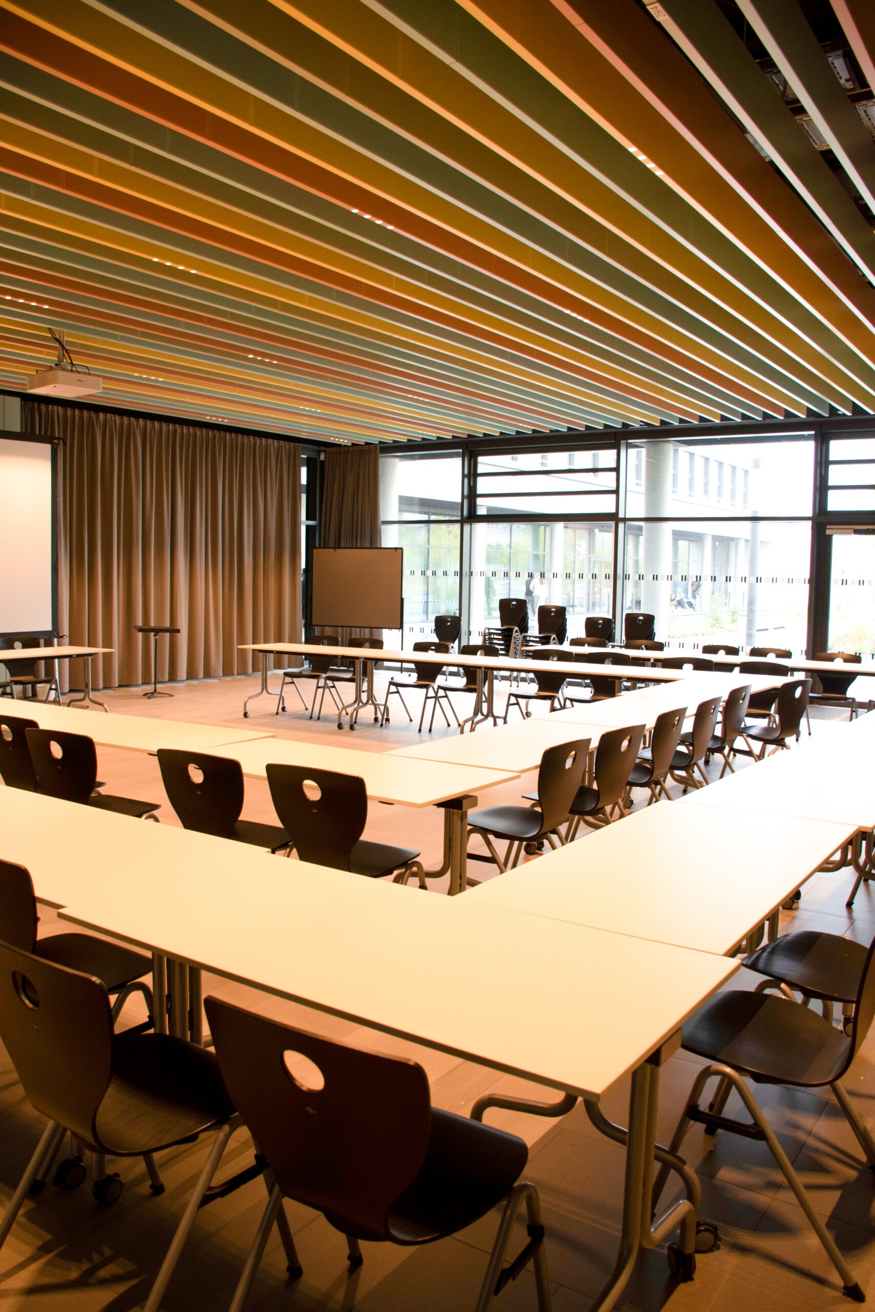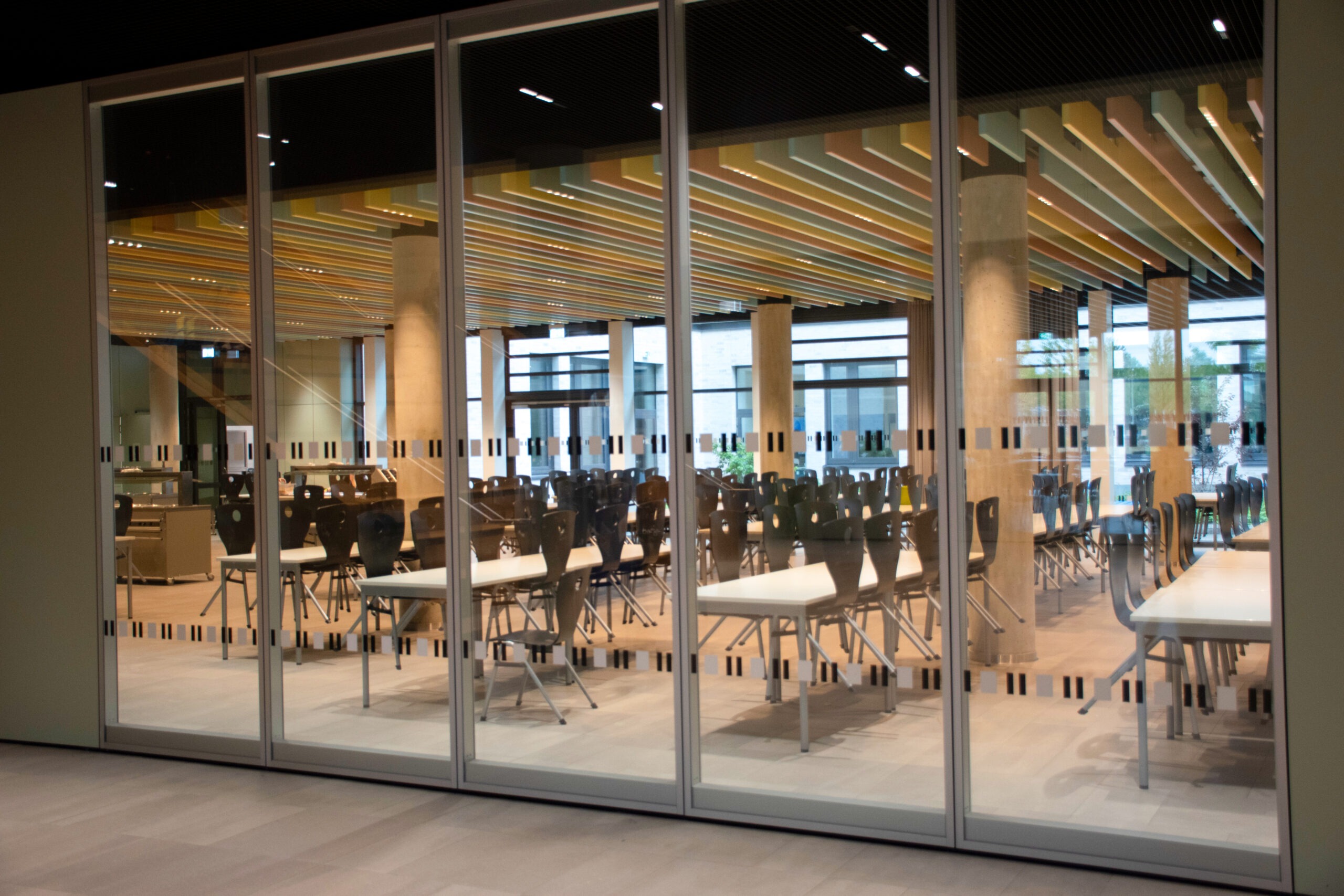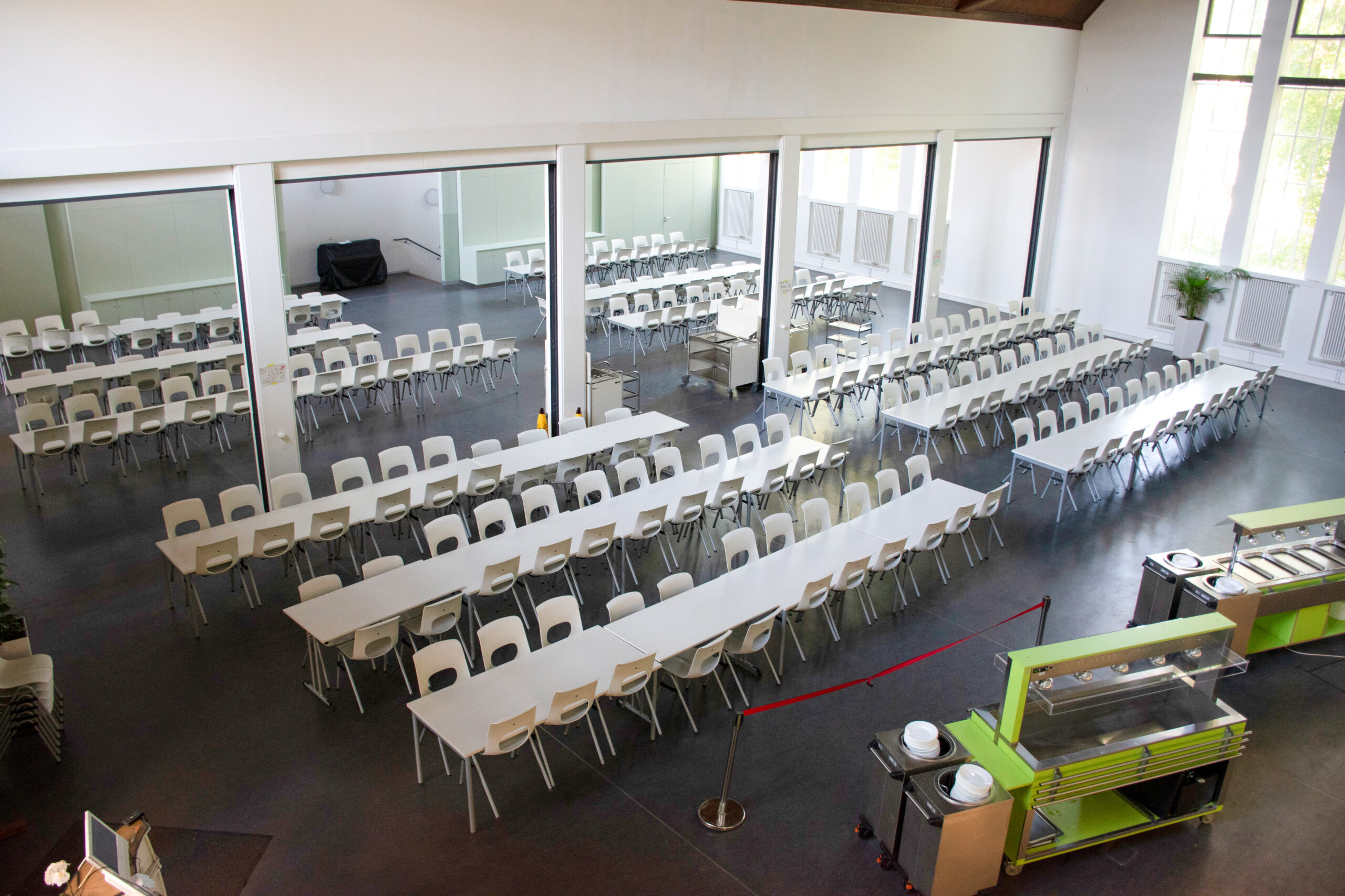 Ein Raum für alle — Der ursprünglich typische Raum des Leipziger Schultyps dient in der Schule am Palmengarten heute als multifunktionaler Bereich. Er wird als Aula, Veranstaltungsort und Speisesaal genutzt, der Lernen und leibliches Wohl der Schülerinnen und Schüler mit kulturellen Events für den Stadtteil verbindet.