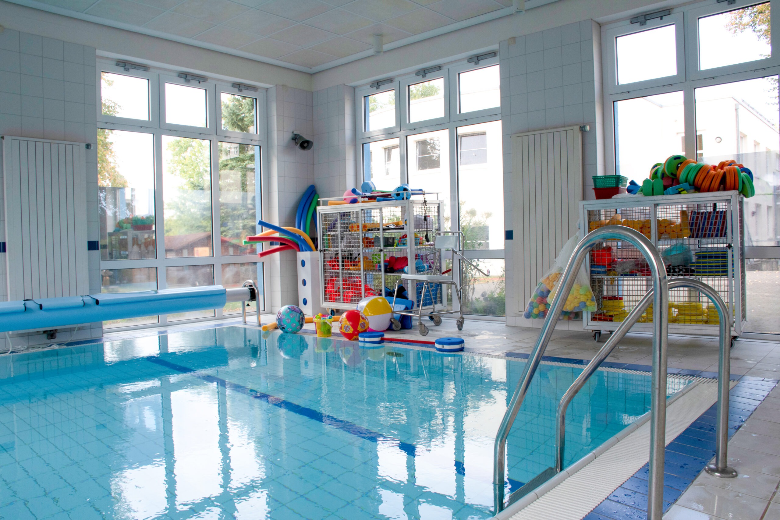 Geteiltes Schwimmen und Klettern — Neben Kursen für Schülerinnen und Schüler gibt es am Werner-Vogel-Schulzentrum Angebote für „Seepferdchenkinder“, Seniorinnen und Senioren sowie den Rehasport. In der Sporthalle der Johanna-Moosdorf-Schule kann man klettern und bouldern – auch jenseits des Unterrichts.