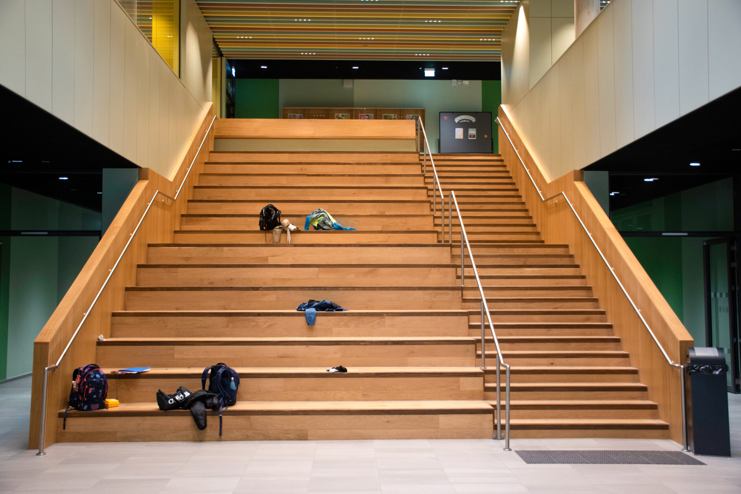 Große Bühne — Die Treppe ist ein Herzstück der Marie-Curie-Schule. Die angrenzenden Mehrzweckräume lassen sich öffnen und schaffen so einen großen Veranstaltungsbereich, der Potenzial für Schule und Stadtteil bietet. Die zentrale Treppe wird zur Bühne für Theater und Chorkonzert.